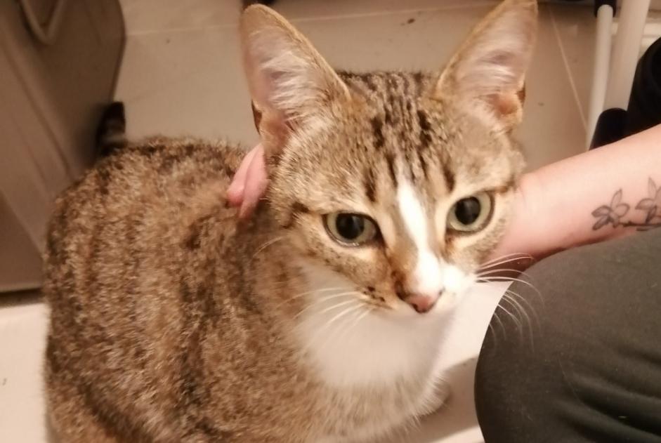 Chat trouvé à Gradignan Chat Race: Européen Sexe: Femelle Taille: 40cm Poids: 3kg Couleur: Tigré / Gris / Blanc Effrayé / peureux