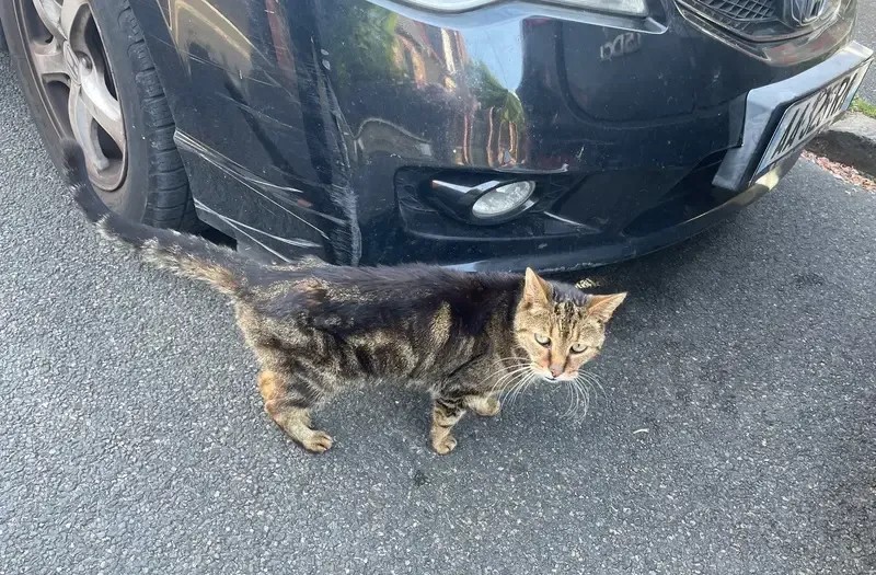 Chat plutôt maigre et perdu. Il est tigré et miaule beaucoup.