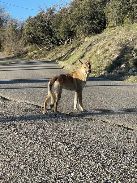 Bonjour, vu ce jour sur la route entre Auribeau et Saignon, apparemment déjà là hier, ne se laisse pas approcher, pas de collier, pas de tatouage apparent, boite du train arriÚre