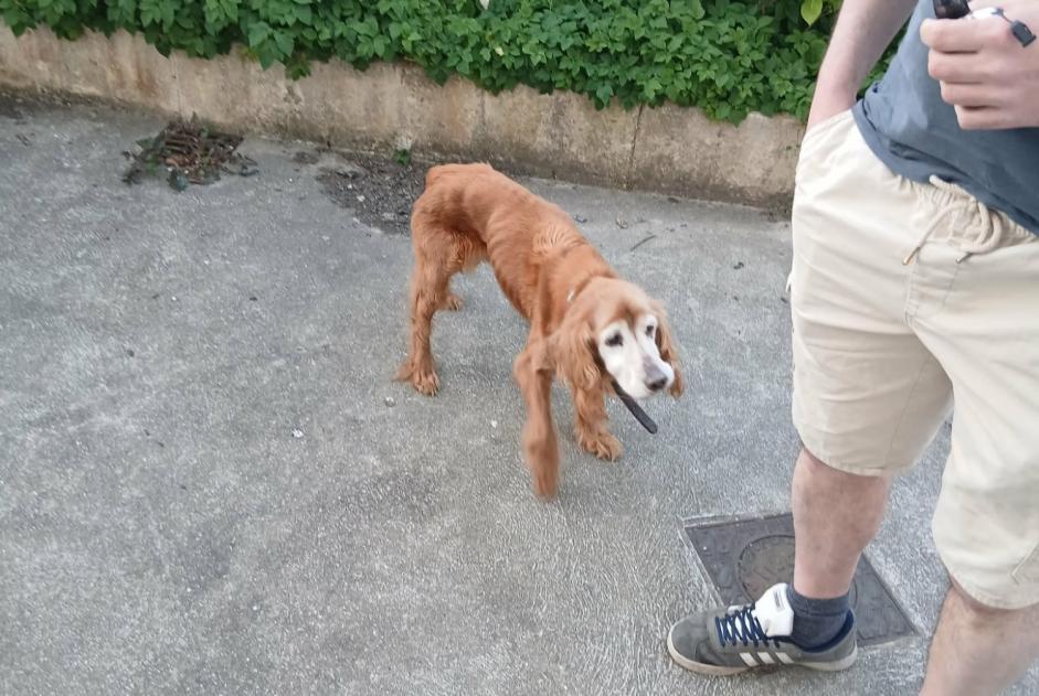 Chien trouvé à Fécamp Chien Race: Cocker américain Sexe: Mùle Taille: 40cm Poids: 10kg Couleur: Roux / Blanc