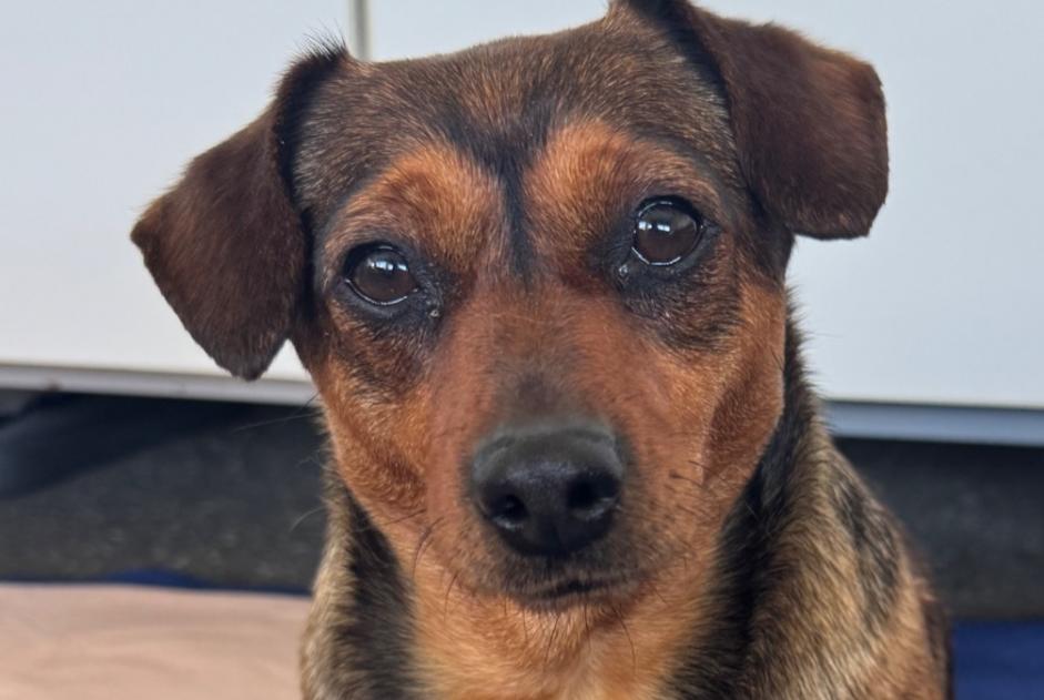 Chien trouvé à Mertzwiller Chien Race: Teckel Sexe: Femelle Taille: 24cm Poids: 7kg Couleur: Brun foncé / Brun / Brun doré