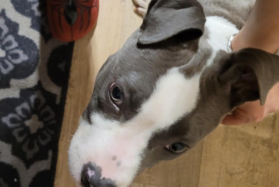Chien trouvé à Saint-Brice-sous-Forêt Chien Race: Staffordshire Bull Terrier Sexe: Femelle Taille: 30cm Poids: 8kg Couleur: Gris / Blanc